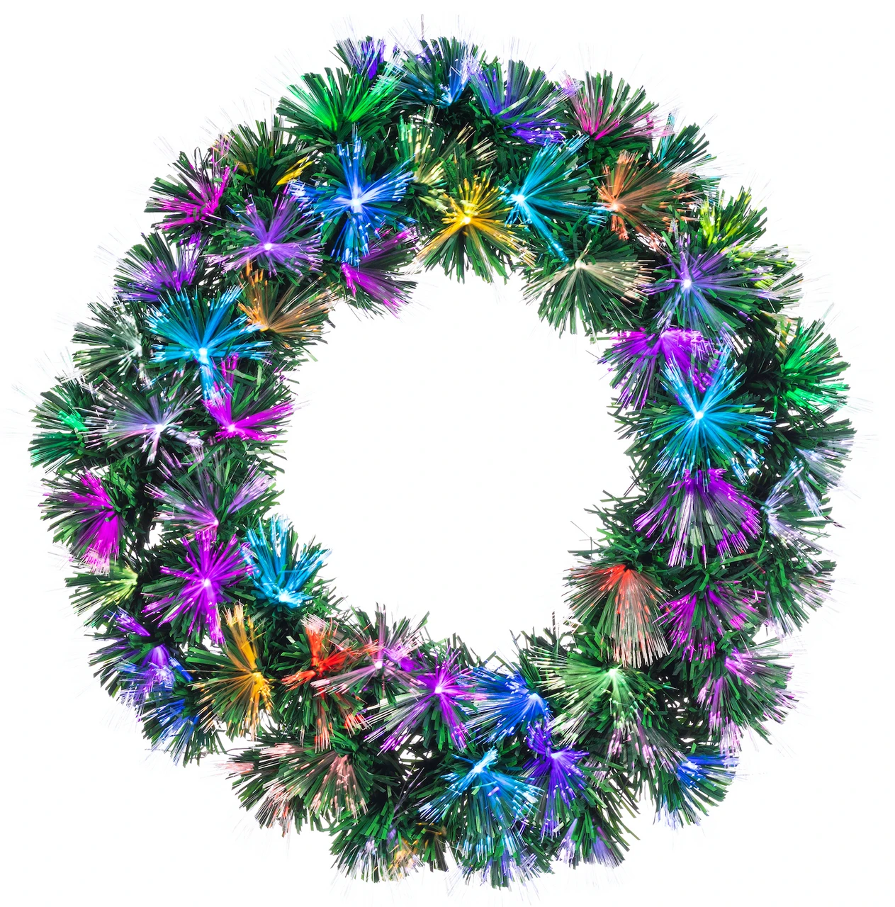 Brighten up your doorway or wall with the 24 Inches Multicolor Fiber Optic Wreath. This wreath is threaded with multi-color fiber-optic lights or a warm, twinkling effect. Durable steel forms the wreath’s frame, covered in brushy PVC needles with a deep green color.