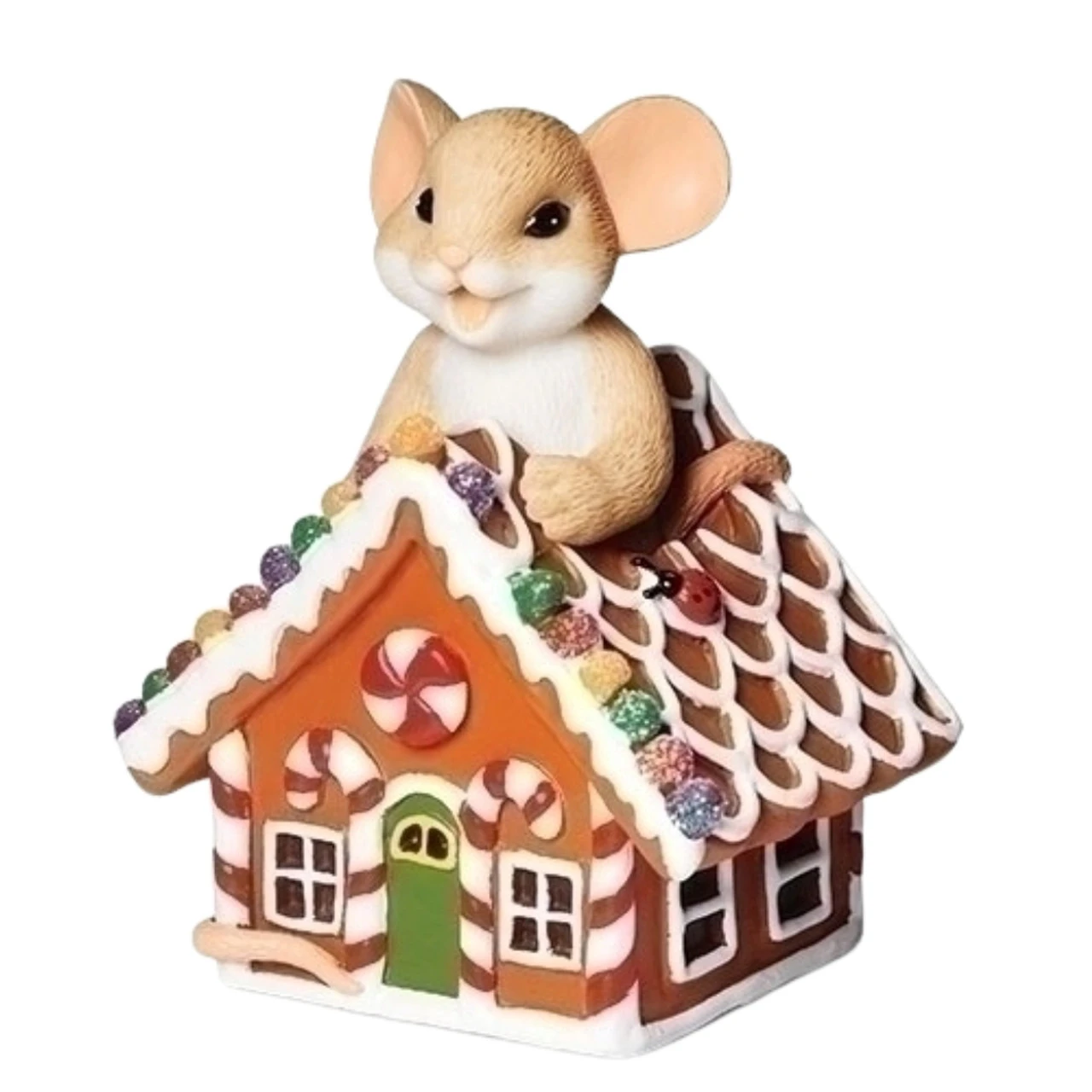 This adorable furry friend will undoubtedly turn any frown upside down. It features a happy little mouse sitting on a gingerbread house. Display this figure to add some whimsy to your Christmas decor.