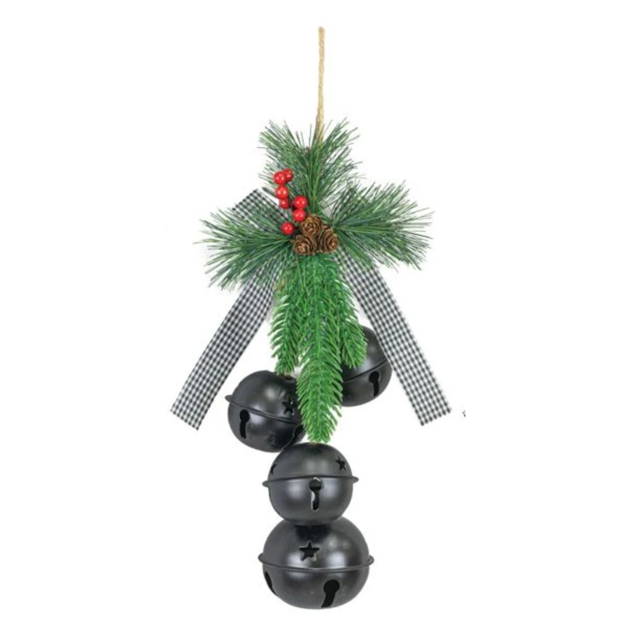 During the Christmas season bells symbolize the beginning of the season and the birth of Jesus. Four black sleigh bells in various sizes hang on some rope attached with some festive ribbon and greenery. Place these bells on a door or wall.