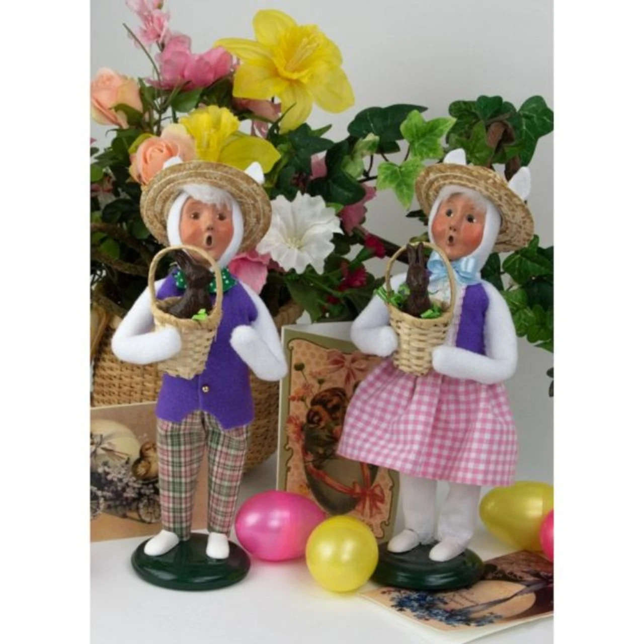 Welcome spring with the Byers’ Choice Easter Girl Caroler. Standing at a delightful 10 inches tall, this whimsical figure embodies the joyous spirit of Easter. Dressed in a playful pink checked skirt and a vibrant purple vest, she’s the epitome of springtime charm. Resembling a sprightly bunny, she’s eager and ready to join the egg hunt. This caroler adds a festive touch to your Easter celebrations, transforming your space into a heartwarming scene of springtime cheer and childlike wonder.