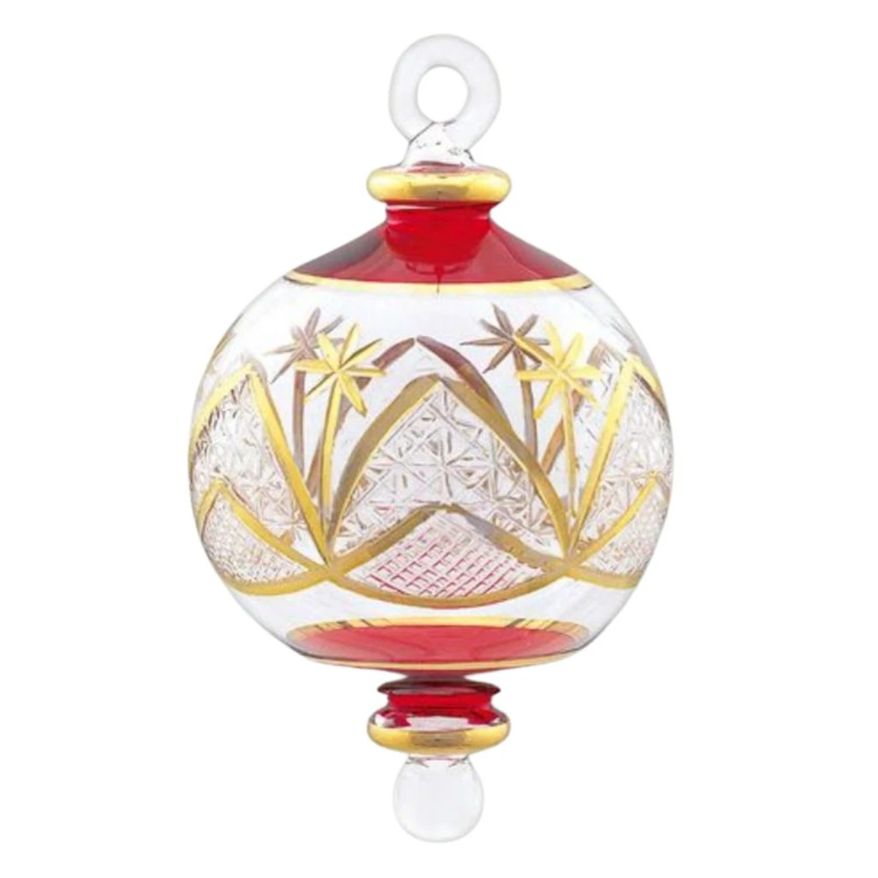 - This ornament features gold painted curved lines and flowers with red at the top and bottom of the sphere.