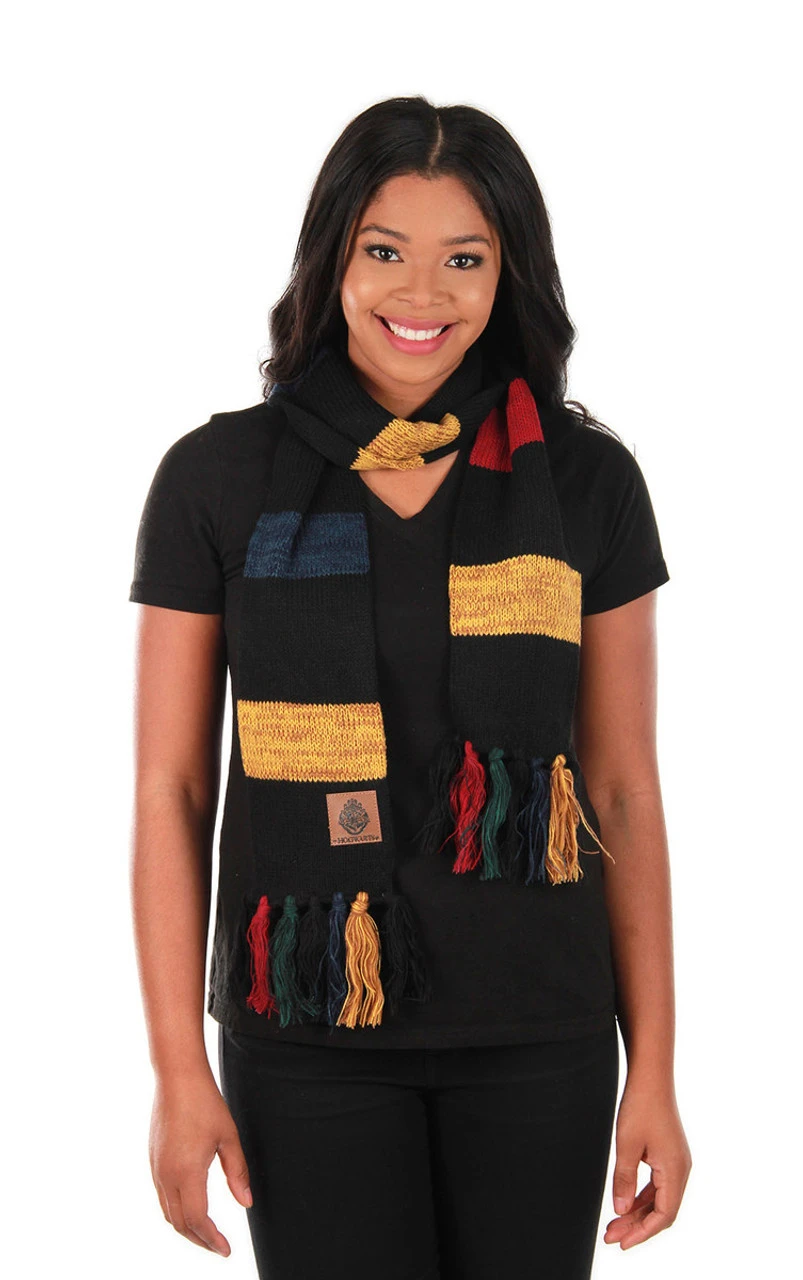 Wrap yourself in luxurious HOGWARTSâ„¢ pride when you wear this HARRY POTTERâ„¢ Hogwarts Heathered Knit Scarf in homespun inspired colors. Super-soft and silky, the 100% acrylic knit offers both comfort and style for everyday fashion or cosplay. Heathered, or interwoven colors, deepen the standard crest colors, and Harry Potter fans will love the visual appeal. A faux leather patch featuring the classic Hogwarts crest finishes the tasseled look. Whether you’re headed out for winter adventure or simply bundling up against the cold, magic awaits when you wear this Hogwarts Heathered Knit Scarf by elope.