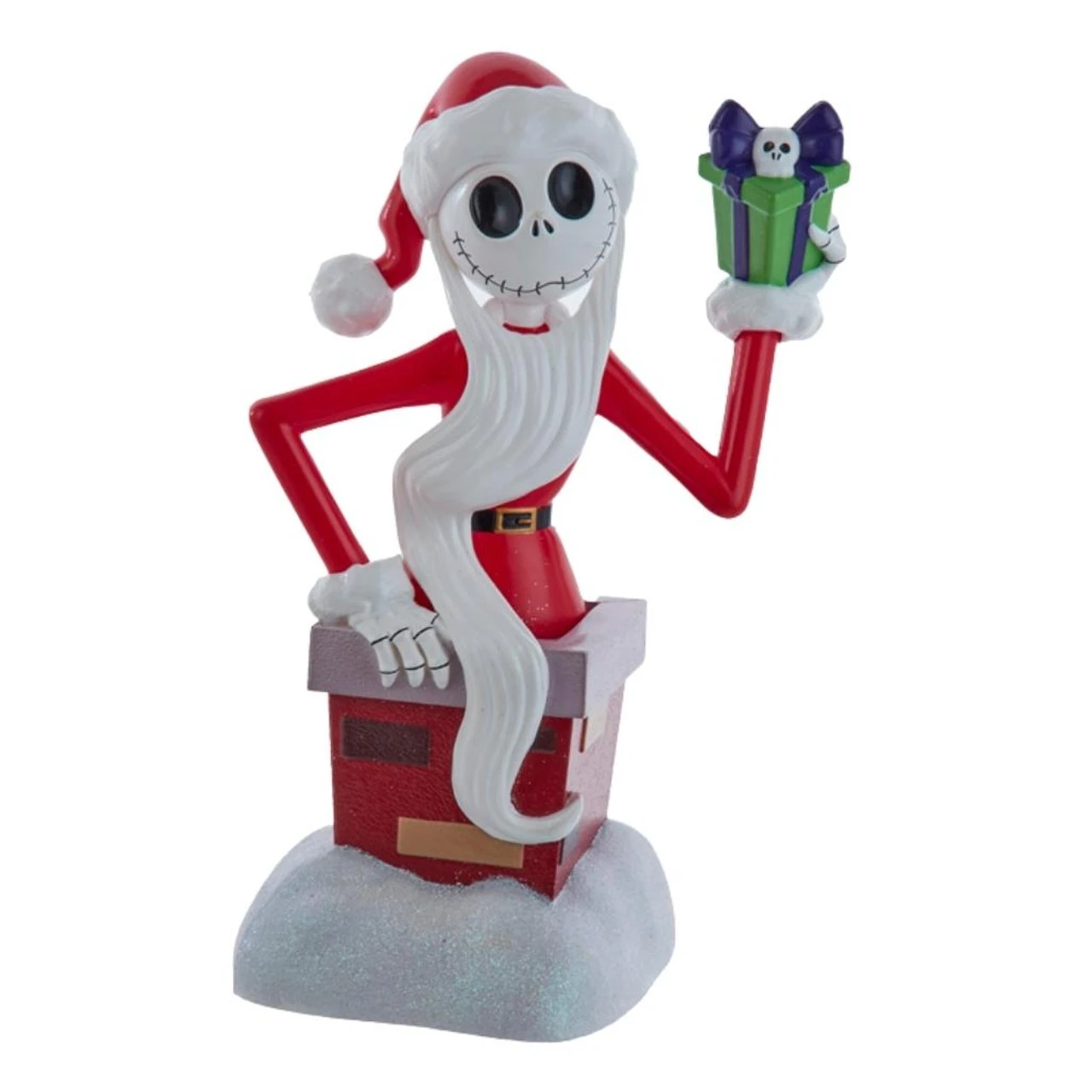 This 10-Inch Disney Nightmare Before Christmas Jack Skellington Treetop from Kurt Adler is a unique addition to your Christmas décor. This treetop features Jack Skellington dressed as Santa (AKA “Sandy Claws”) going down a chimney surrounded by snow. He holds a green present in his hand, adorned with a skull. Perfect for fans of the Nightmare Before Christmas.
