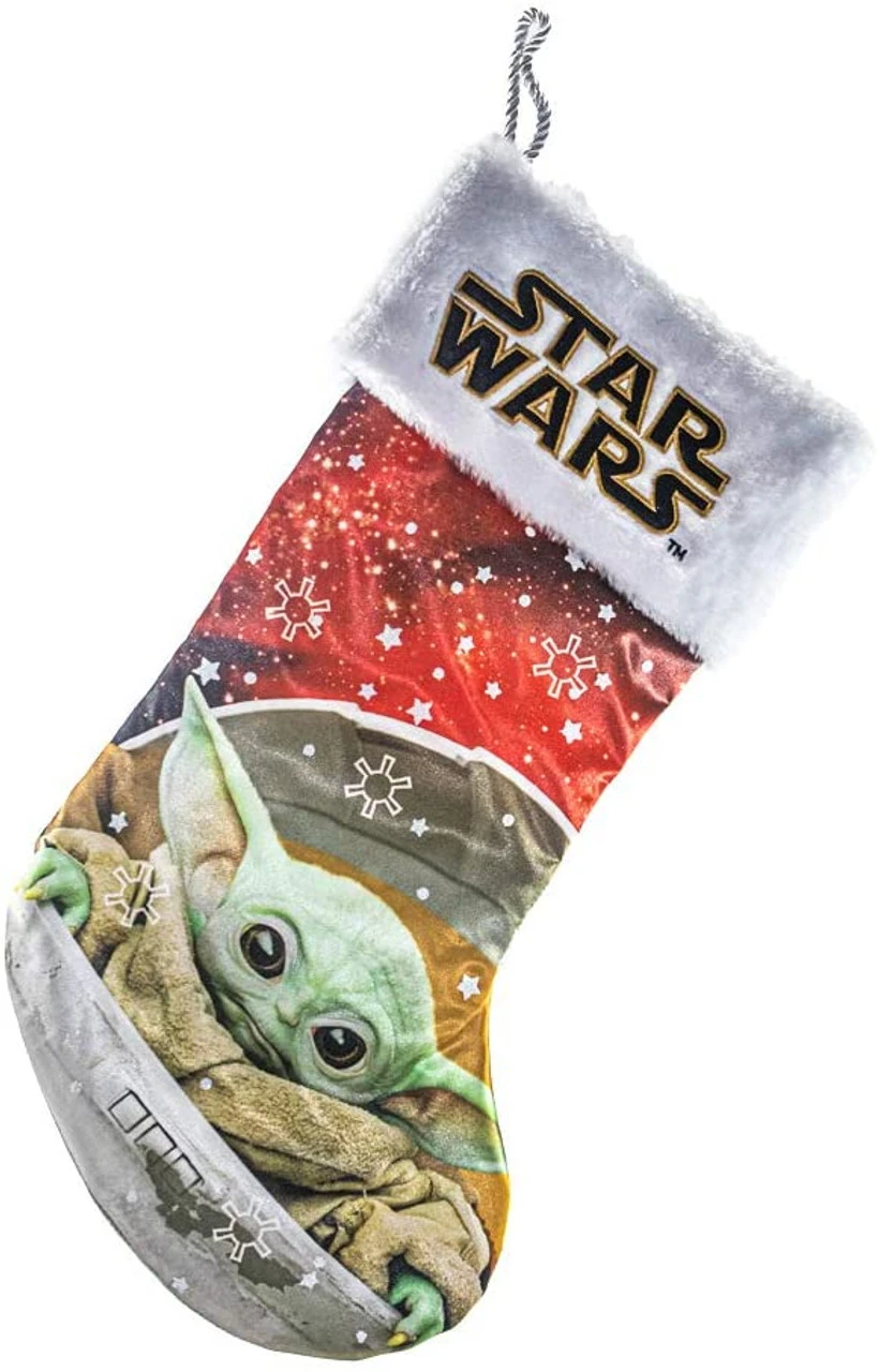 Celebrate the holidays with this Star Wars™ “The Child” stocking from Kurt Adler. This 19-inch red stocking features “The Child” AKA Baby Yoda with snowflakes, trees and green trim.