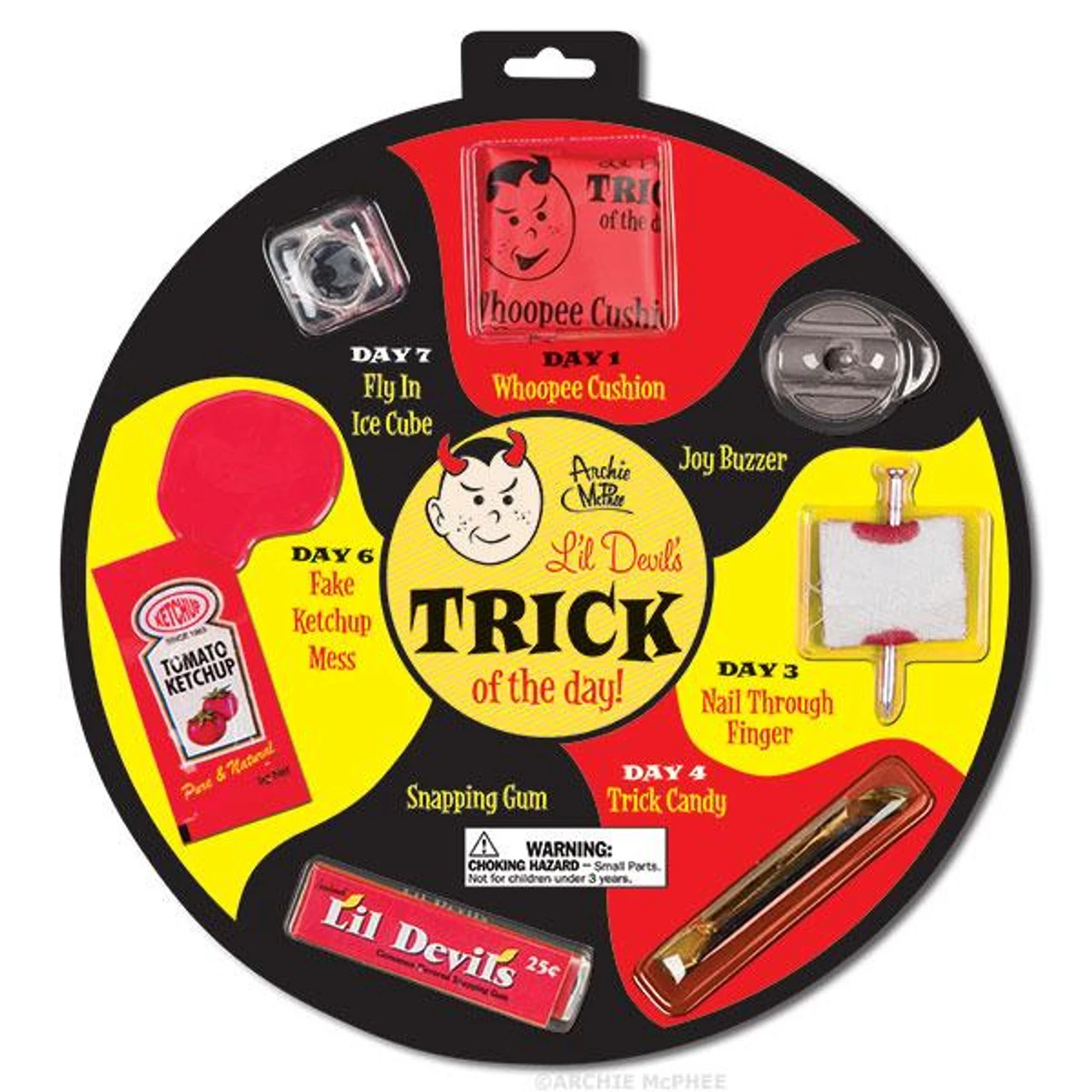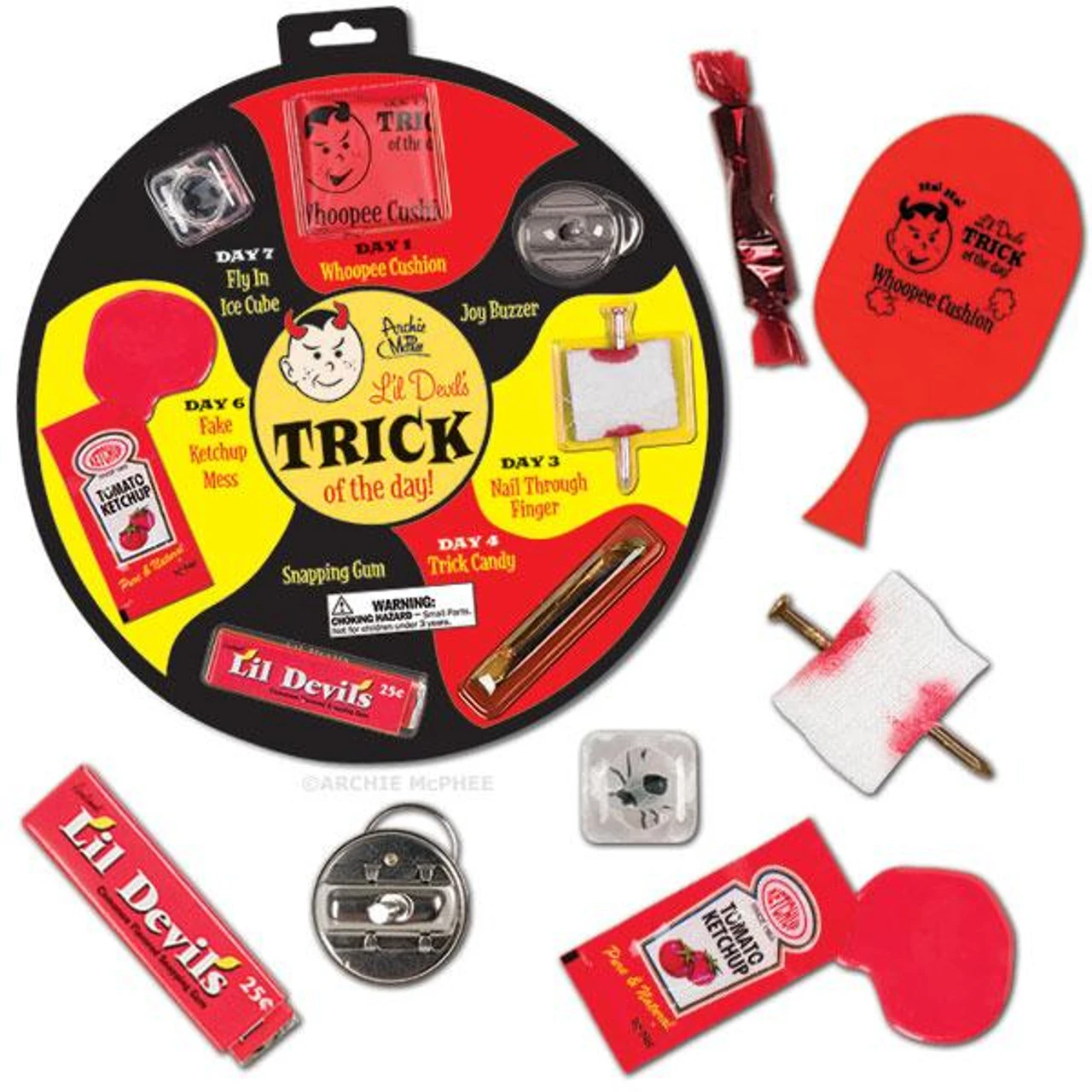 Make every day a laugh-fest with this set of seven classic tricks, pranks, and practical jokes. Each set includes a Whoopee Cushion, a Joy Buzzer, a Nail Through Finger trick, a piece of Trick Candy, a pack of Snapping Gum, a Fake Ketchup Mess, and a Fly in the Ice Cube trick. Perfect for conniving children or nostalgic adults. 10-1/2″ (26.7 cm) round illustrated blister card.