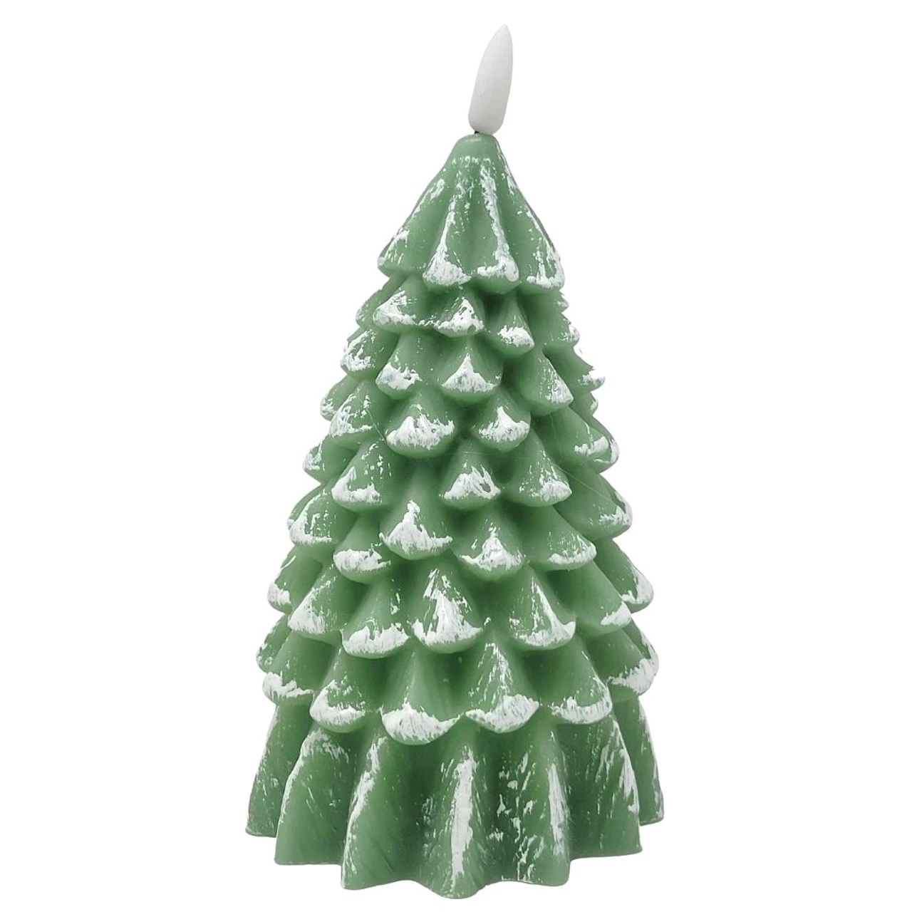 This green flocked LED wax flameless tree candle will impress everyone this winter. Insert 2 AAA batteries and turn the tree on to see the flame at the top glow making it look like a real lit candle. No more smoke or flames to worry about. Flip the switch to Timer and watch as the flame stays lit for 6 hours, turns off for 18 hours, and turns back on at the same time each day.Â