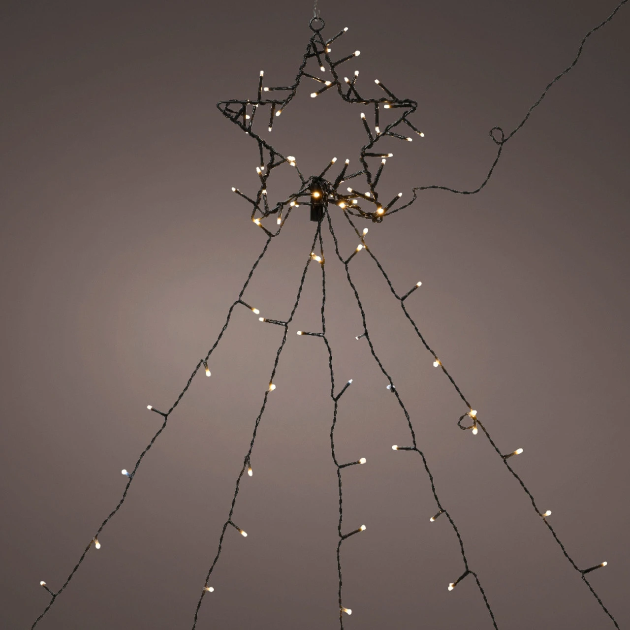 Illuminate your festive celebrations with the Lumineo 255 LED Shooting Star, a stunning blend of nostalgia and modern brilliance. Designed for both indoor and outdoor spectacles, this piece boasts alternating classic and warm white lights on 5 6.8-foot strands of sleek black wire, creating a mesmerizing twinkle effect that captivates and enchants. Whether hung gracefully using the loop or perched atop a tree with its dedicated base, this versatile star transforms any setting. The five strings cascade from the star, allowing for a radiant spread when placed on your tree. With 8 dynamic functions and an integrated timer, the Lumineo Shooting Star is a beacon of festive elegance, ensuring your decor shines brightest.