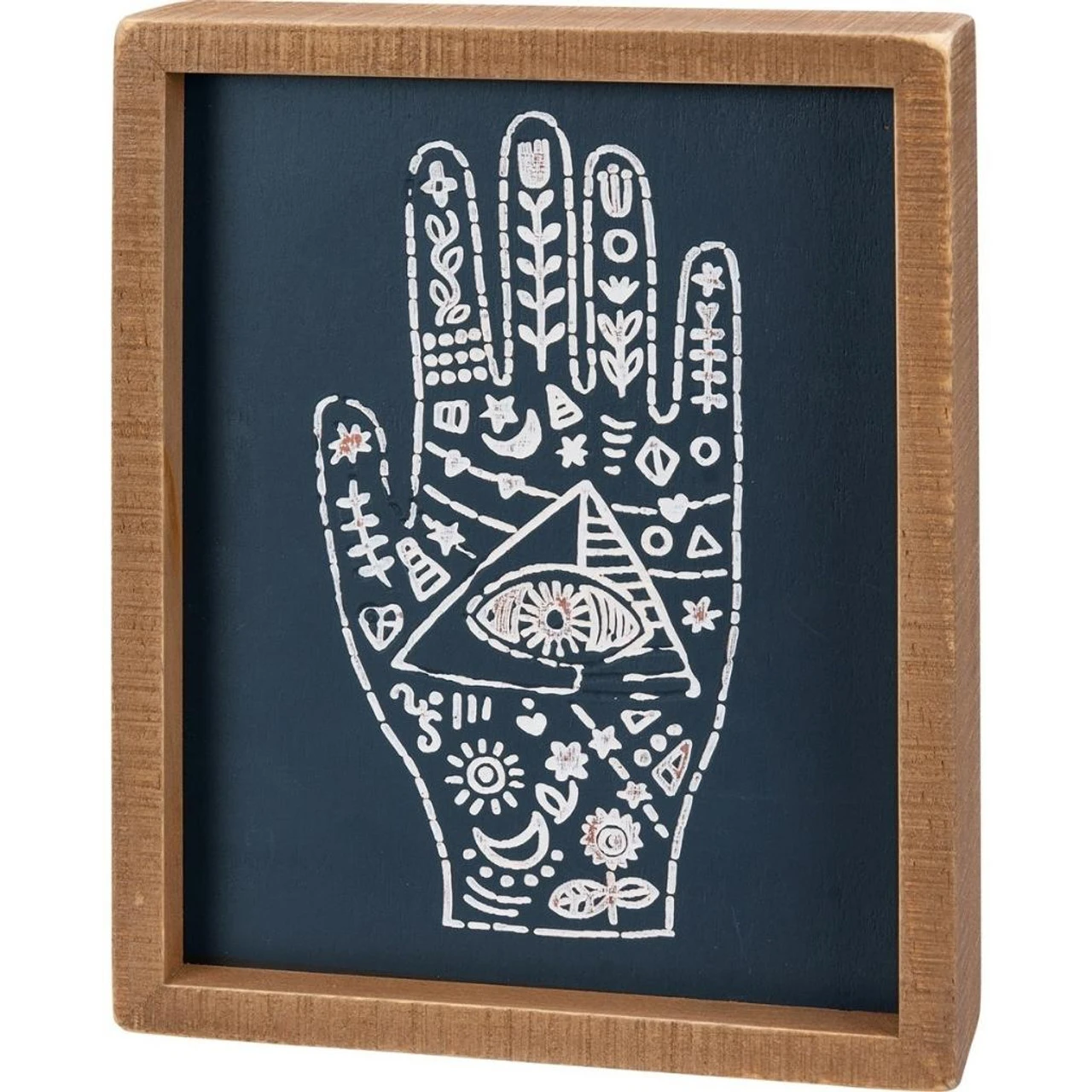 A wooden box sign from our Celestial Collection features an embossed hand with celestial designs inside, dark blue background, and natural wood sides for added interest. Our Palmistry box sign is easy to hang or can free-stand alone.