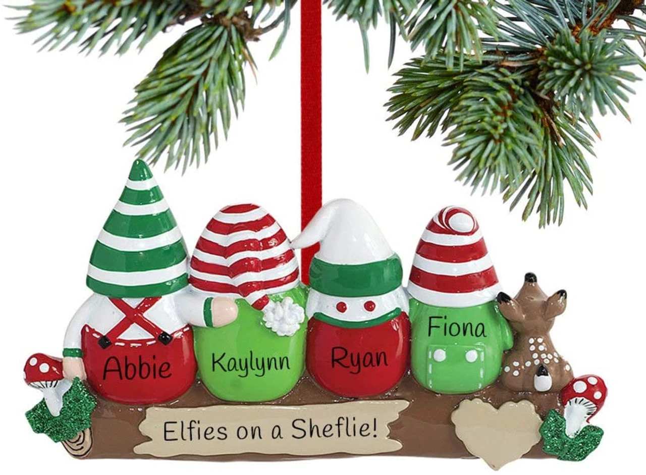 Personalized Gnome on Tree Family of 4 OrnamentÂ