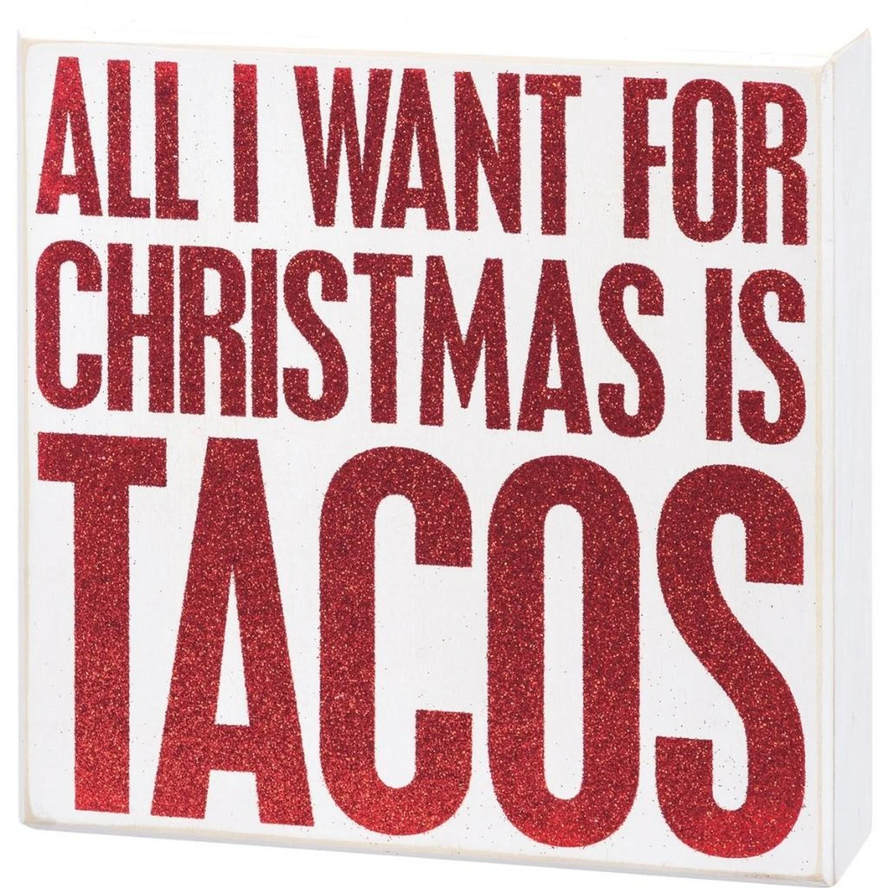 A white wooden box sign featuring an “All I Want For Christmas Is Tacos” sentiment with red glitter details. Easy to hang or can free-stand alone.