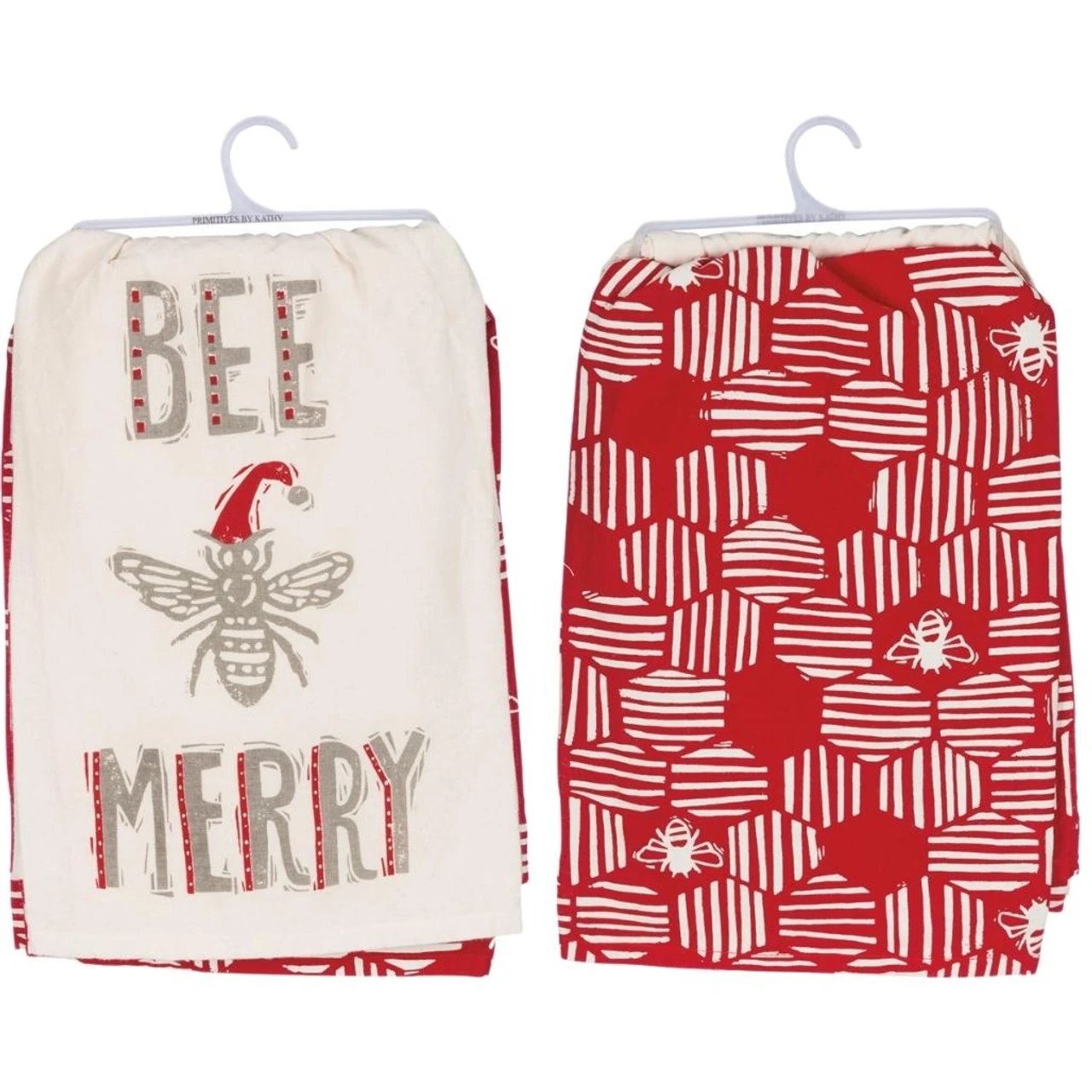 Set of two Christmas-themed kitchen towels featuring intricate, age-old block carving and printmaking techniques. One towel lends “Bee Merry” sentiment with a bumblebee in a Santa hat design and is paired with a coordinating replicated honeycomb and bee patterned towel. Complements well with similar block print pieces to make for a festive collection. Machine-washable.