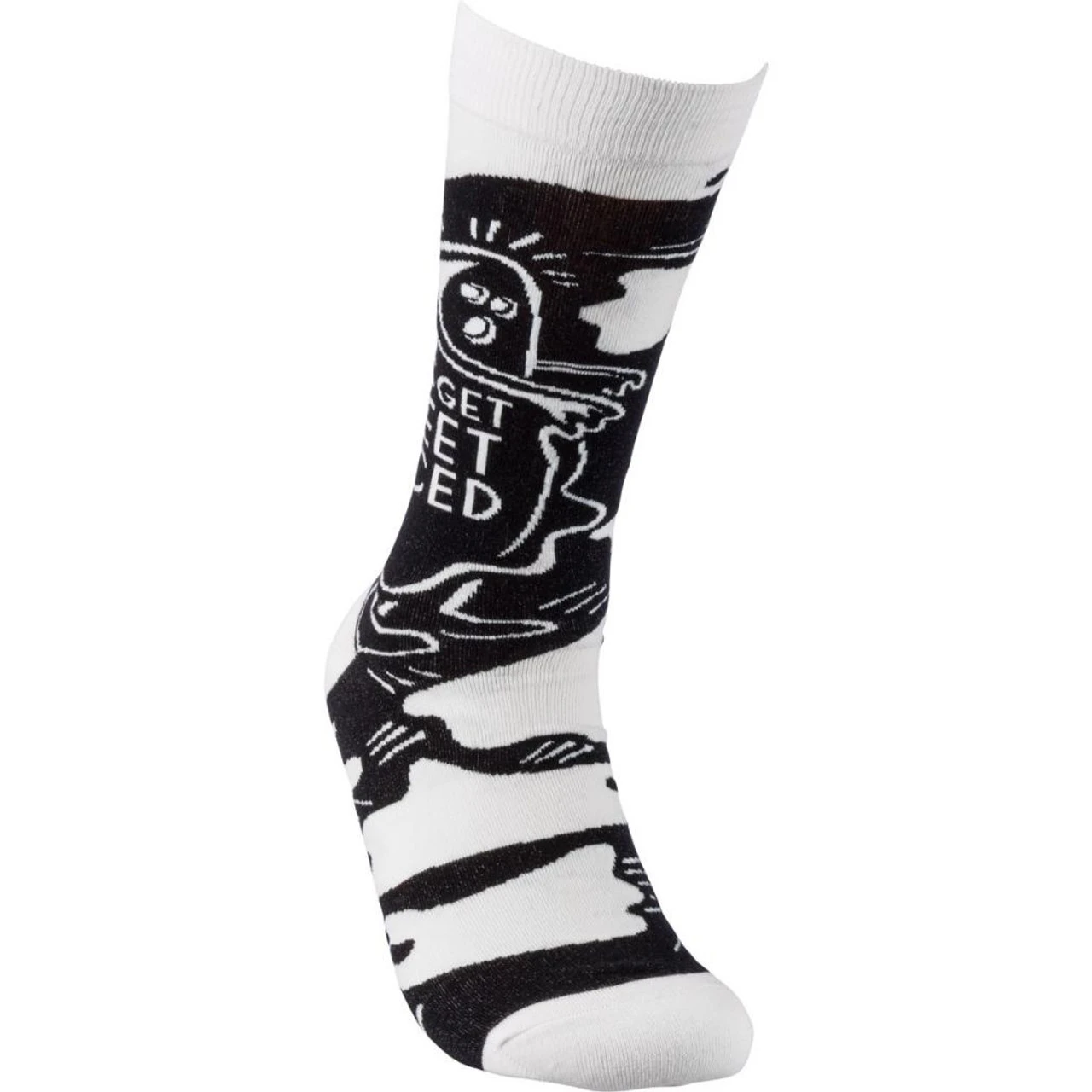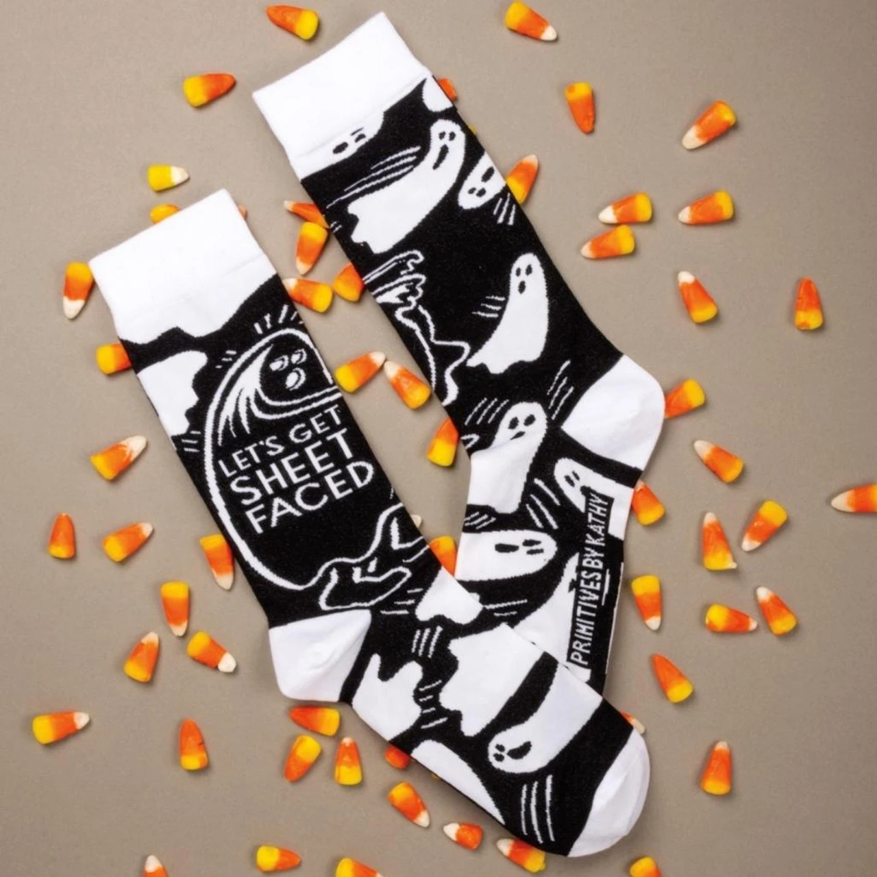 These colorful socks feature woven designs with a coordinating “Let’s Get Sheet Faced” sentiment. Cotton, nylon, spandex. One size fits most.