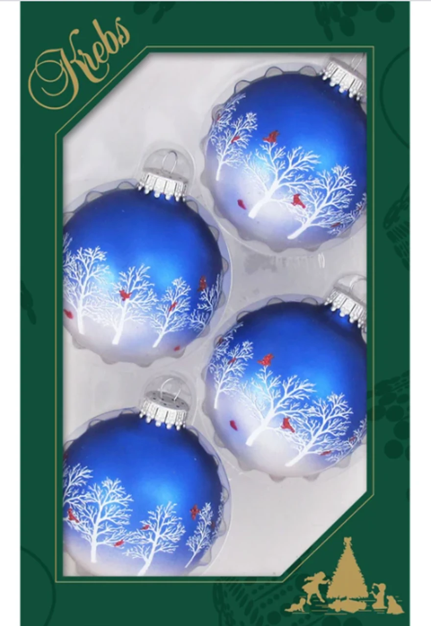 This set of 4 bi-colored ornaments is a fun pop of color to any Christmas tree. Each ornament features white glittered trees with red cardinals soaring through the winter sky.Â