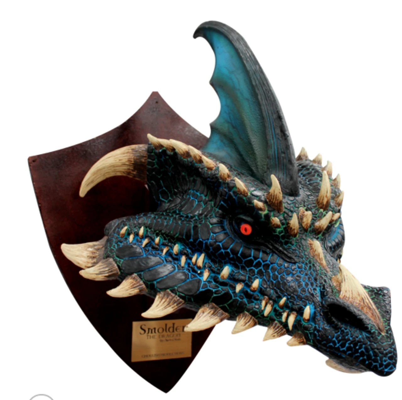 Show off to any guest that you are the dragon slayer and defender of your kingdom. This trophey of Smolder the black dragon, is a great show piece for any man-cave, entertainment area or as a decor piece. The black dragons head is hand crafted and hand painted. Mounted on the trophy board it has battery operated glowing red eyes.