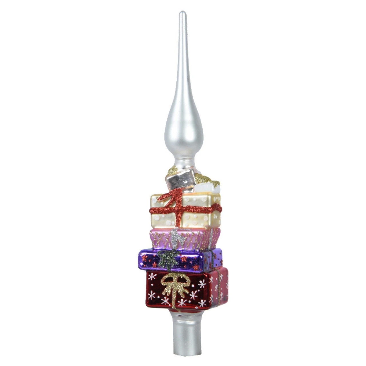 Complete your Christmas tree with our exquisite blown glass finial tree topper, featuring a charming stack of Christmas gifts. This intricately designed tree topper is hand-crafted from the finest blown glass, showcasing a high level of detail and craftsmanship. The vibrant colors and glittery accents of the stacked gifts add a festive and cheerful touch to your holiday decor. Not only does this unique tree topper make a stunning addition to your own tree, but it also serves as a thoughtful and memorable gift for friends and family, helping them to celebrate the holiday season in style.