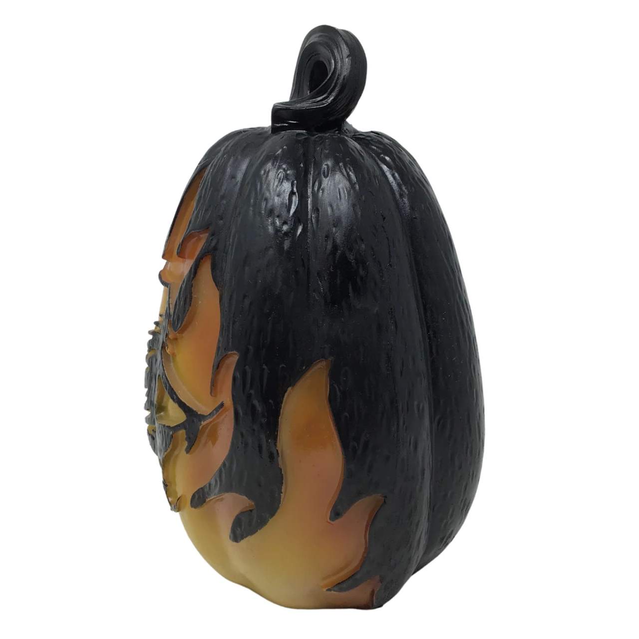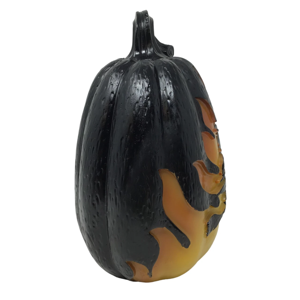 Where could that witch be flying to? Face the piece forward to display the witch flying on her broom or turn it around to keep it as a plain black pumpkin. Features a warm glow looking like flames of a fire this piece makes a wonderful focal point of a display or even a night light.